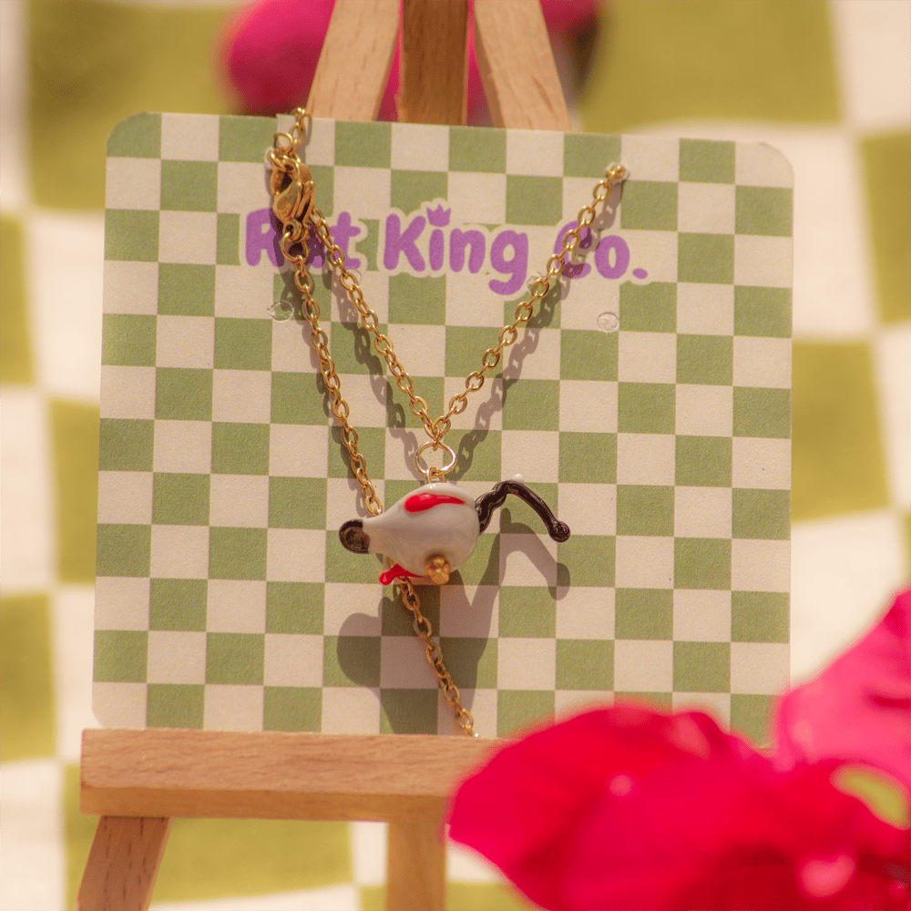 Necklaces come in silver (surgical grade stainless steel) OR gold (18K gold plated stainless steel). All necklaces have a matching rat charm on the back to help with clasping. Charms are attached to the chain so they cannot slip around.